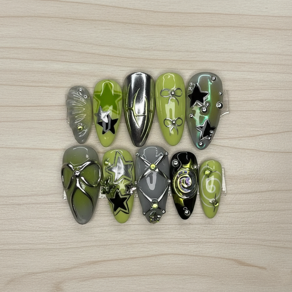 Free Style Green & 3D Silver Bow Press On Nails, Star and Spiral Design, Custom Made False Nails for Holiday, Birthday, Gift Her Special Day